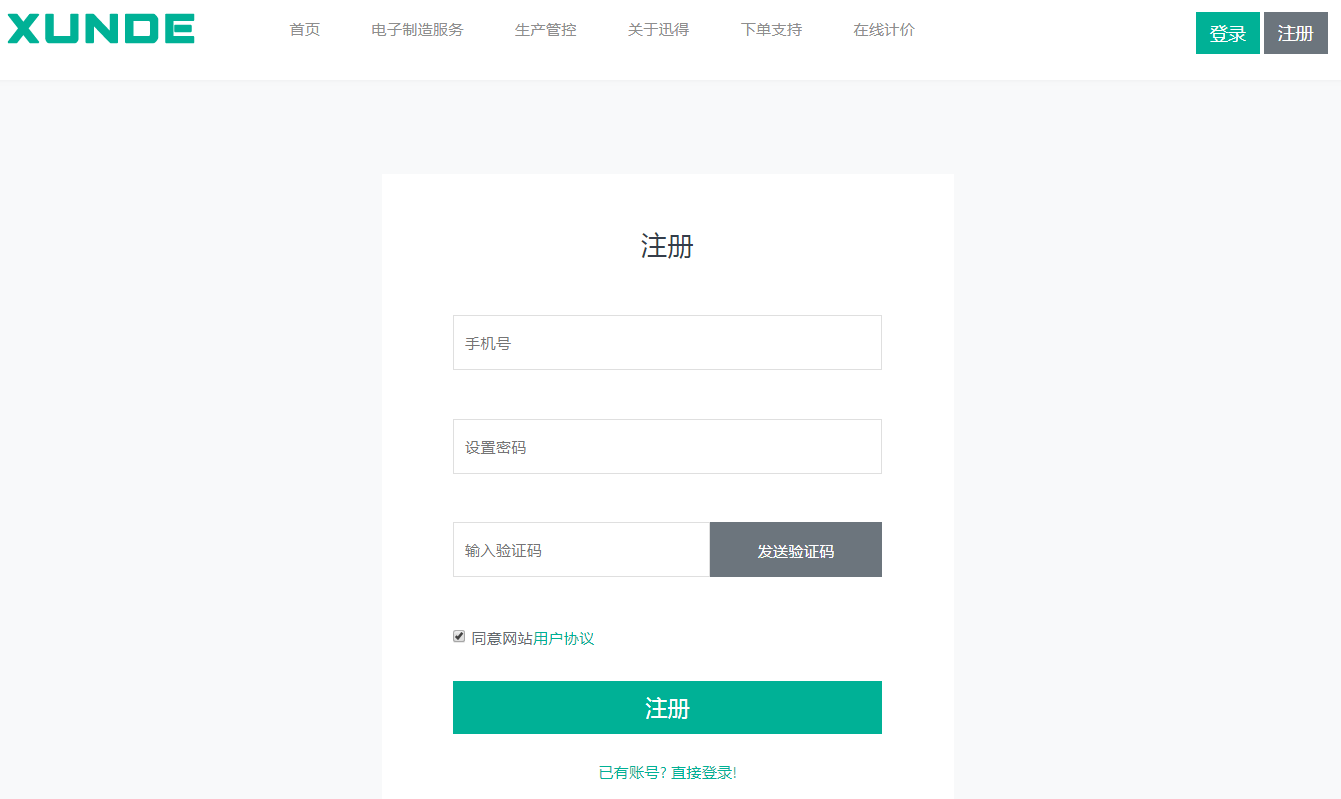 1. 點(diǎn)擊迅得網(wǎng)站右上角“注冊(cè)”按鈕,填寫(xiě)自己有效的手機(jī)號(hào)碼并設(shè)置密碼,然后點(diǎn)擊“發(fā)送驗(yàn)證碼”按鈕,您的手機(jī)會(huì)收到驗(yàn)證碼信息,請(qǐng)將驗(yàn)證碼準(zhǔn)確填寫(xiě)入驗(yàn)證碼處,并勾選“同意網(wǎng)站用戶(hù)協(xié)議”,點(diǎn)擊“注冊(cè)”按鈕,一分鐘便可完成注冊(cè);