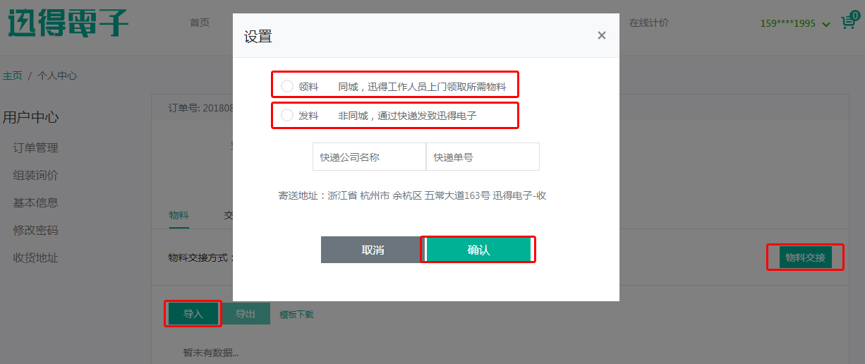 在物料模塊下,可點(diǎn)擊“物料交接”選擇送料方式,我們支持“同城上門(mén)領(lǐng)料”和“料件快遞送達(dá)”兩種方式。選好送料方式,點(diǎn)擊“確認(rèn)”按鈕。然后點(diǎn)擊“導(dǎo)入”按鈕導(dǎo)入料件信息。收到料件后,我們將會(huì)依據(jù)您導(dǎo)入的料件信息進(jìn)行核對(duì)。