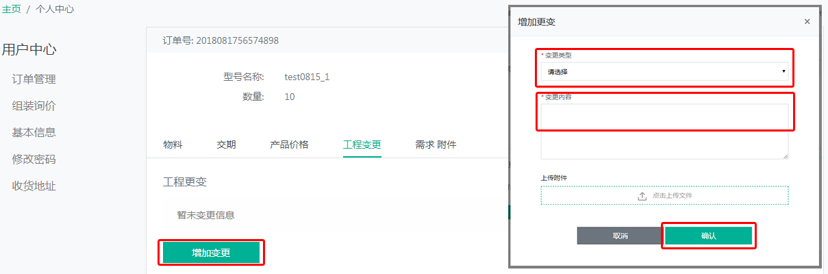2. 若您需要對(duì)該訂單的設(shè)計(jì)或某些料件做更改,請(qǐng)?jiān)凇坝唵喂芾怼?“工程變更”模塊下點(diǎn)擊“增加變更”按鈕,在跳出窗口內(nèi)選擇“變更類(lèi)型”并填寫(xiě)“變更內(nèi)容”,點(diǎn)擊“確認(rèn)”按鈕提交。我們將由專(zhuān)人進(jìn)行審核并處理。系統(tǒng)的工程變更記錄方便我們審核、跟蹤和后續(xù)訂單管理工作。
